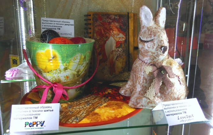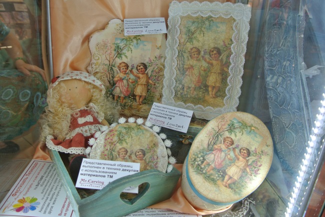 В витринах Вы увидите всевозможные декорированные предметы интерьера (шкатулки, рамки, кухонная утварь, подносы, свечи, зеркала, вазы и др.). Роспись по стеклу и керамике, техника point-to-point, мозаика, различные варианты декупажа, бумажная пластика и т.д.